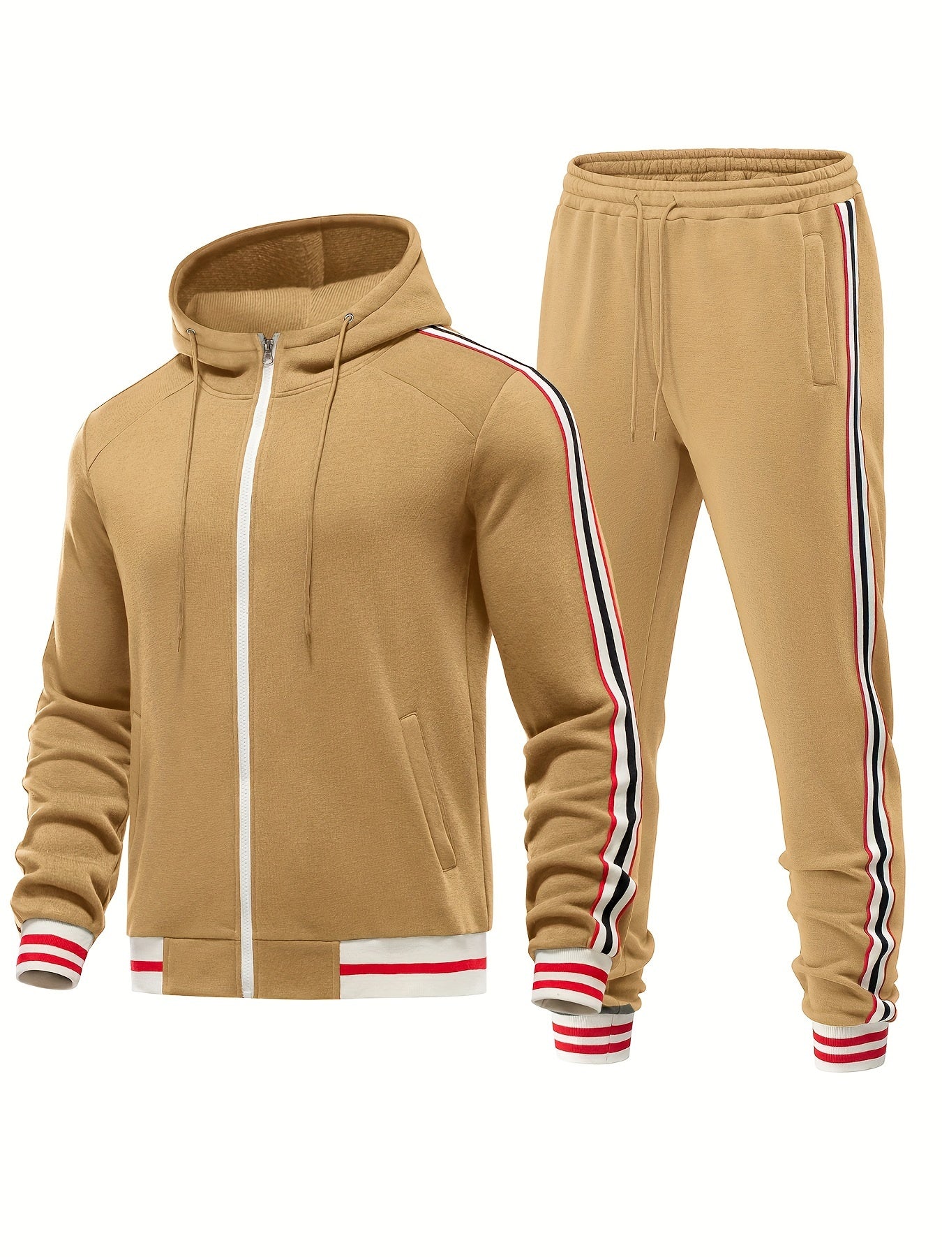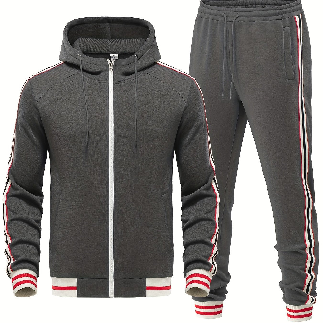 The Men’s Hoodie & Joggers Set includes a zip-up hoodie with stripe accents and matching joggers. Designed as a coordinated outfit, it functions as everyday apparel suitable for regular wear.