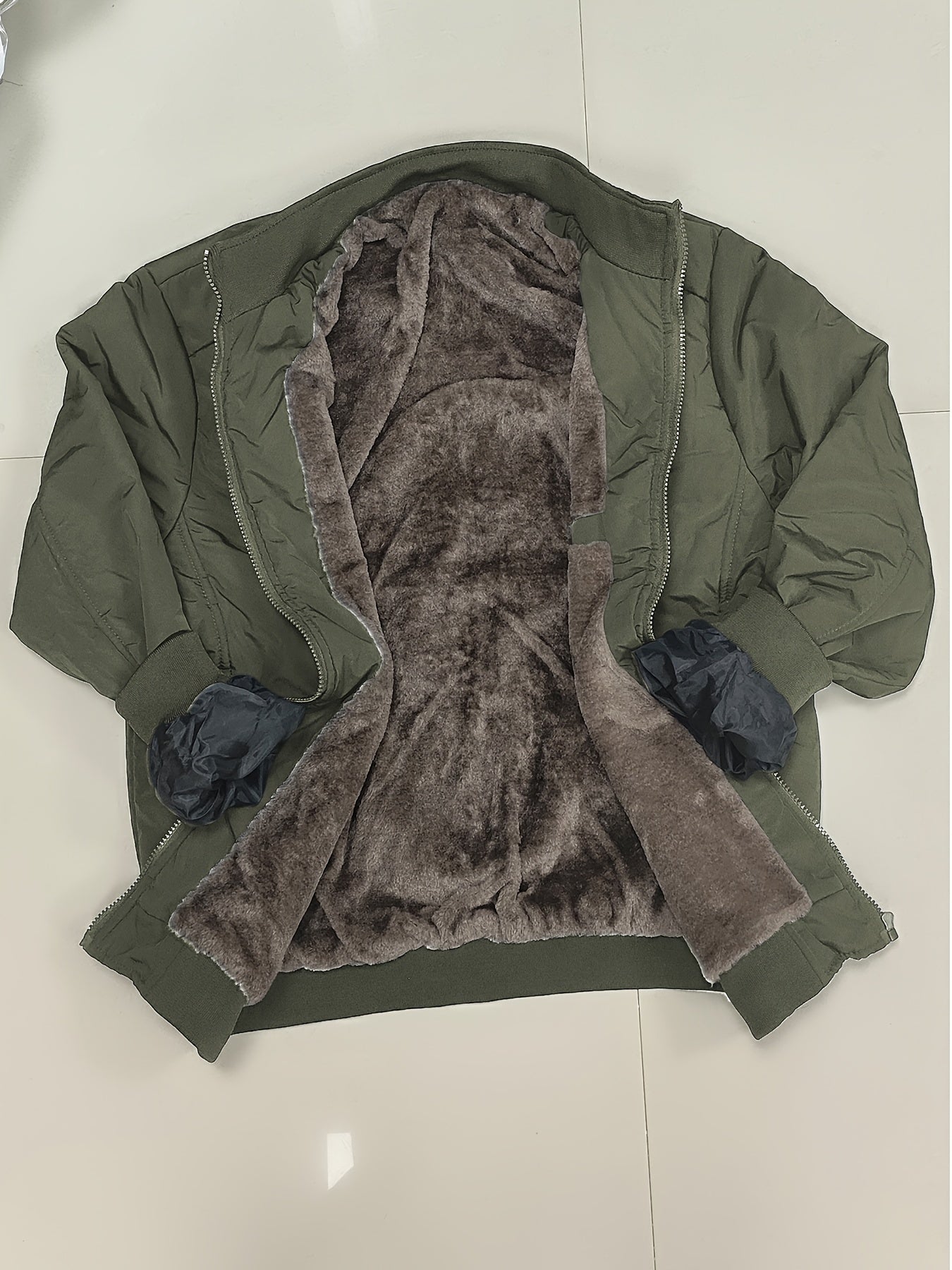 - Style Details: Stand collar, ribbed cuffs, zippered pockets
