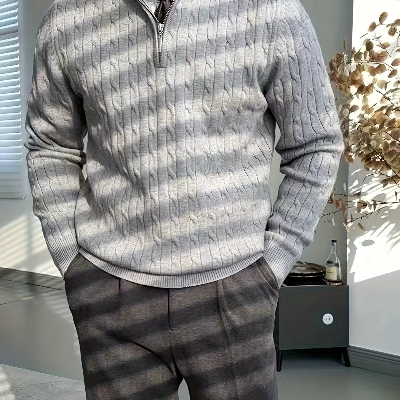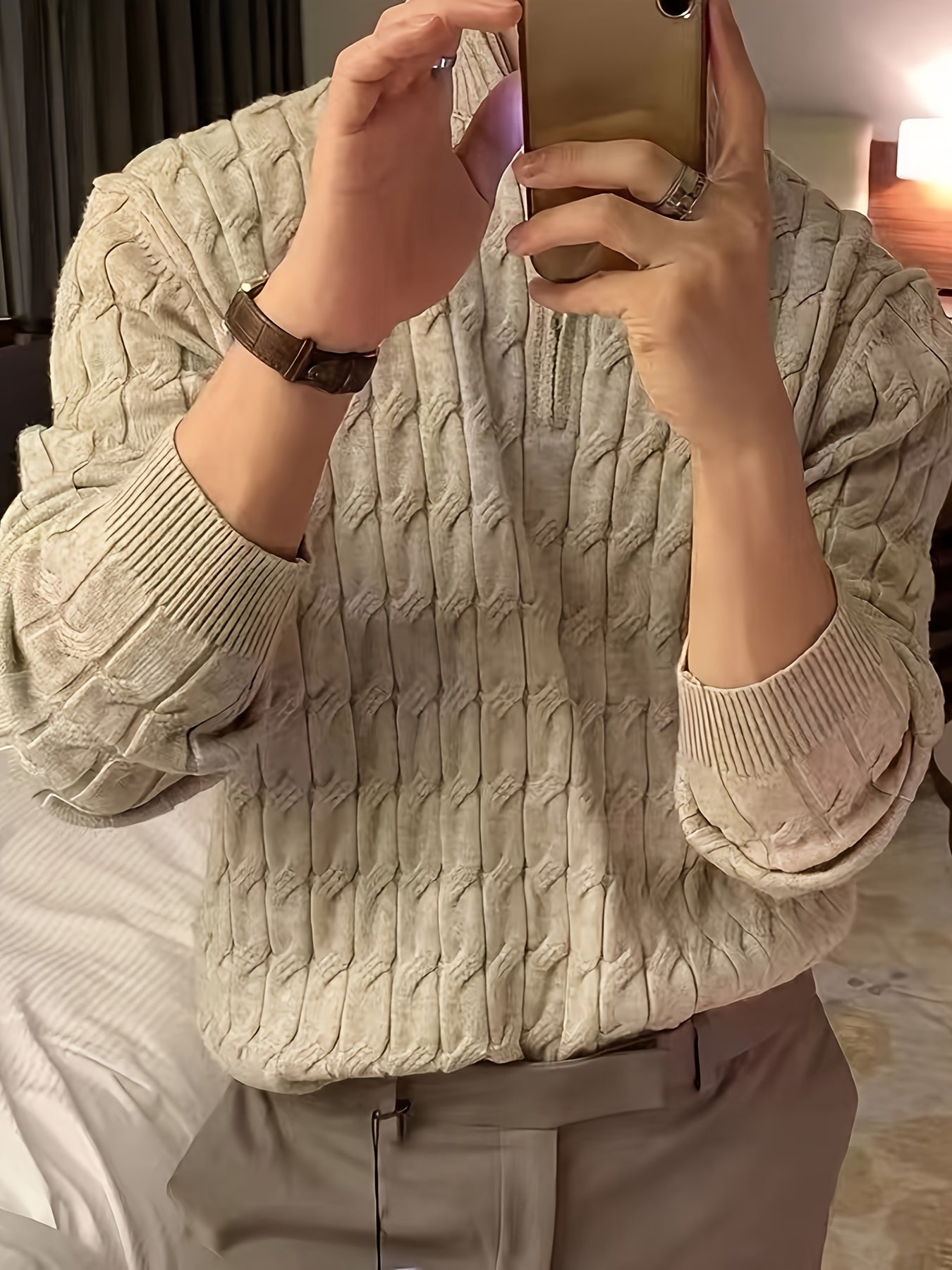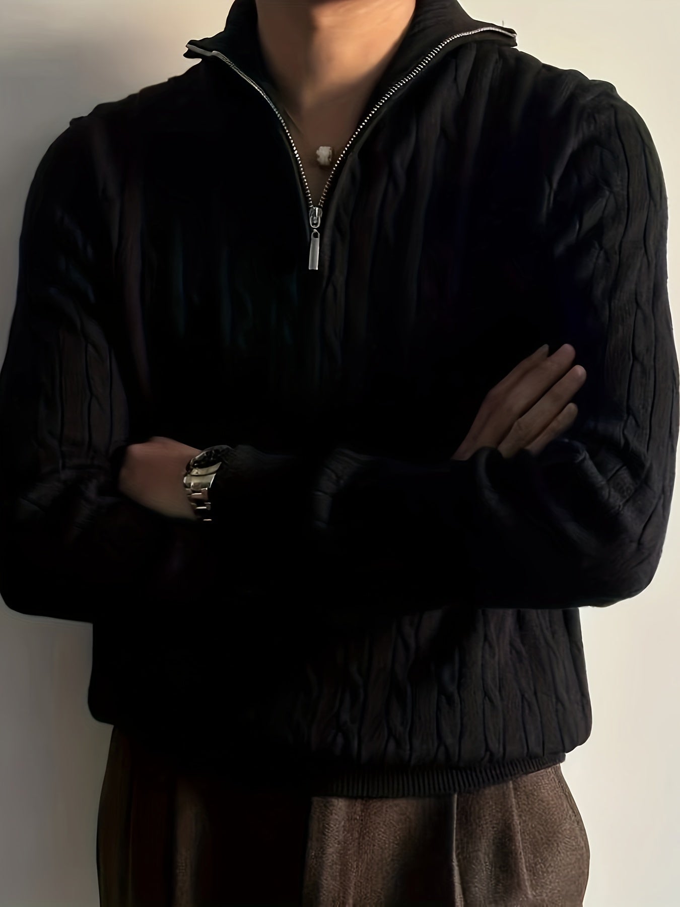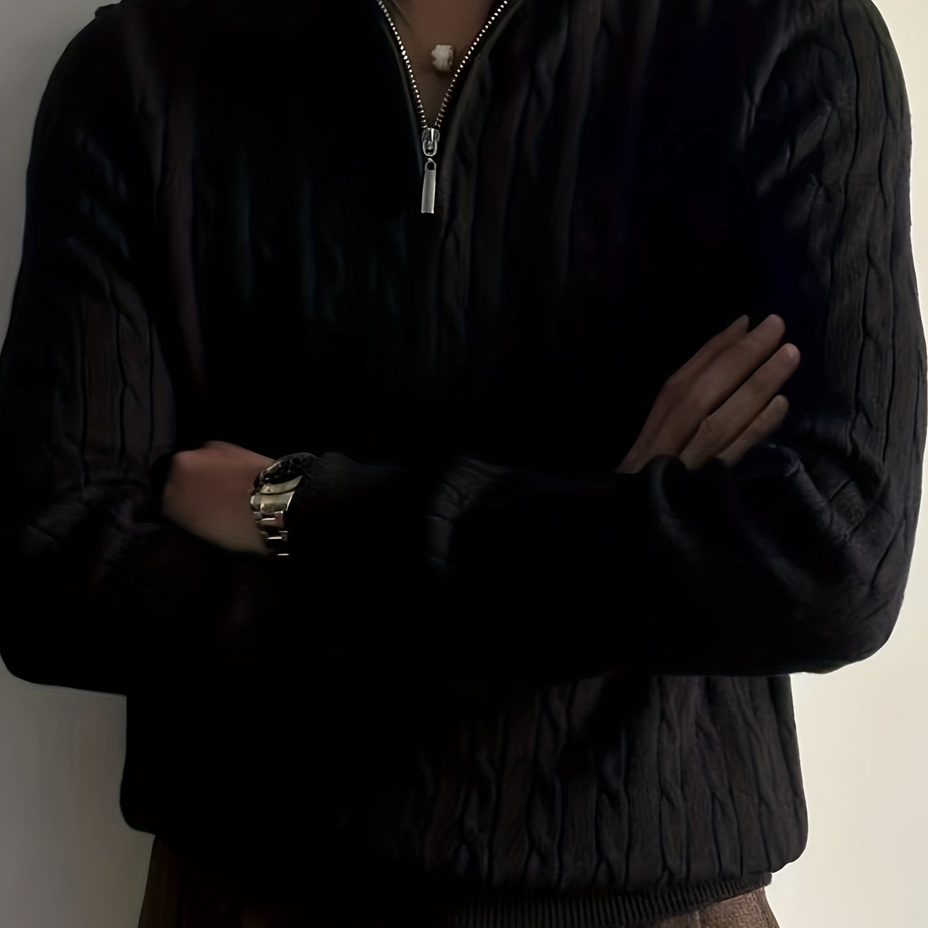 The Men’s Half-Zip Knit Sweater features a zippered neckline and integrated zip pockets. Designed with medium-stretch knit, it functions as an everyday layering option suitable for different outfits.