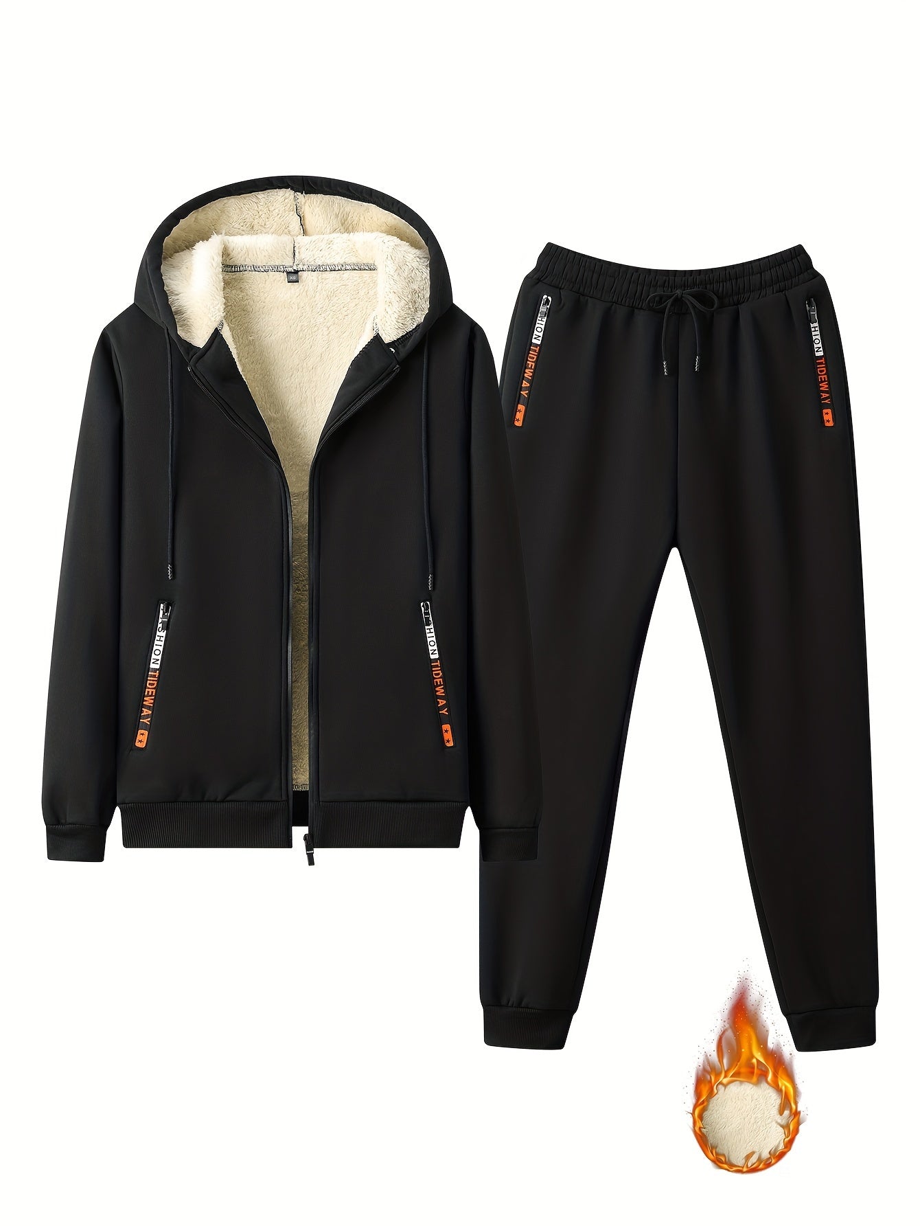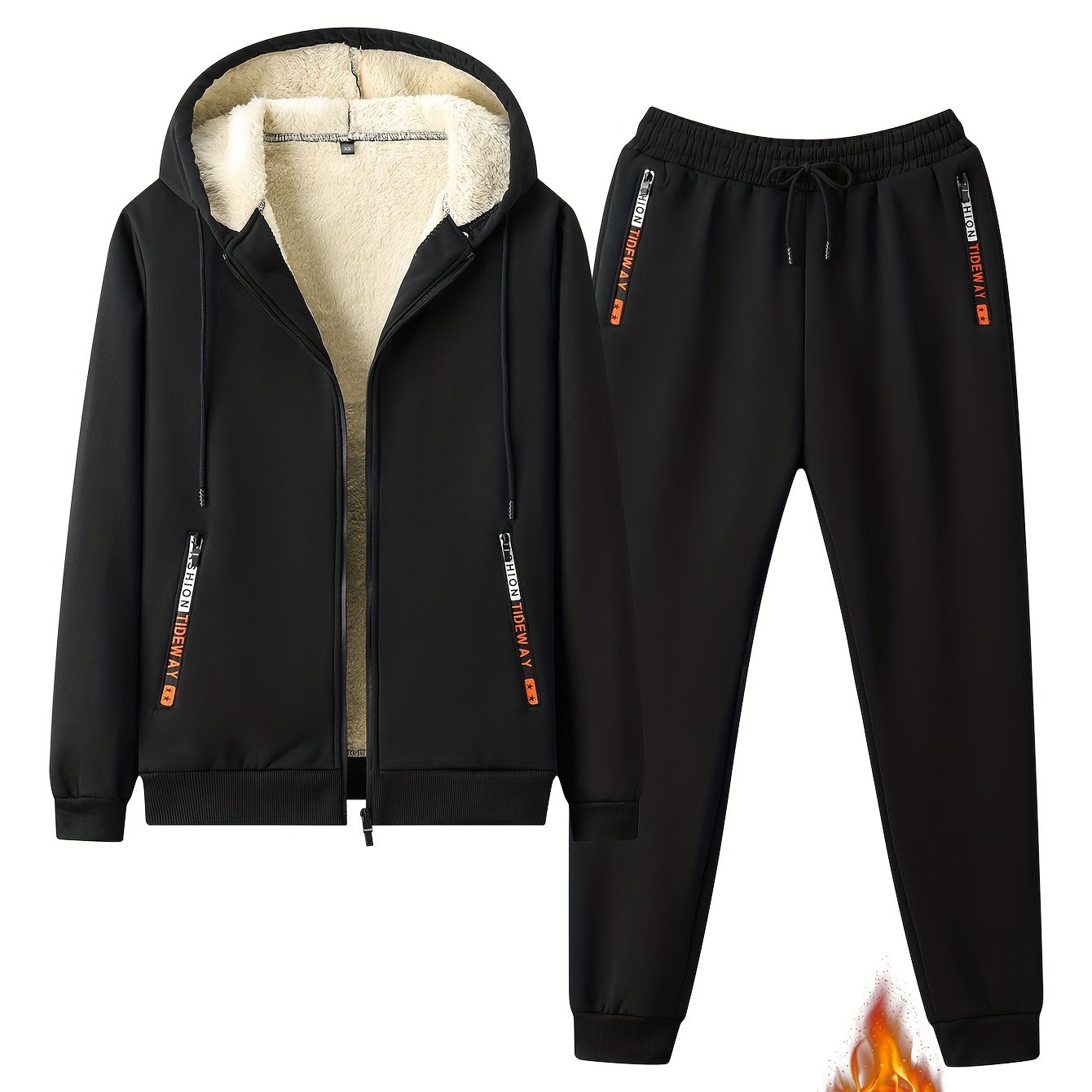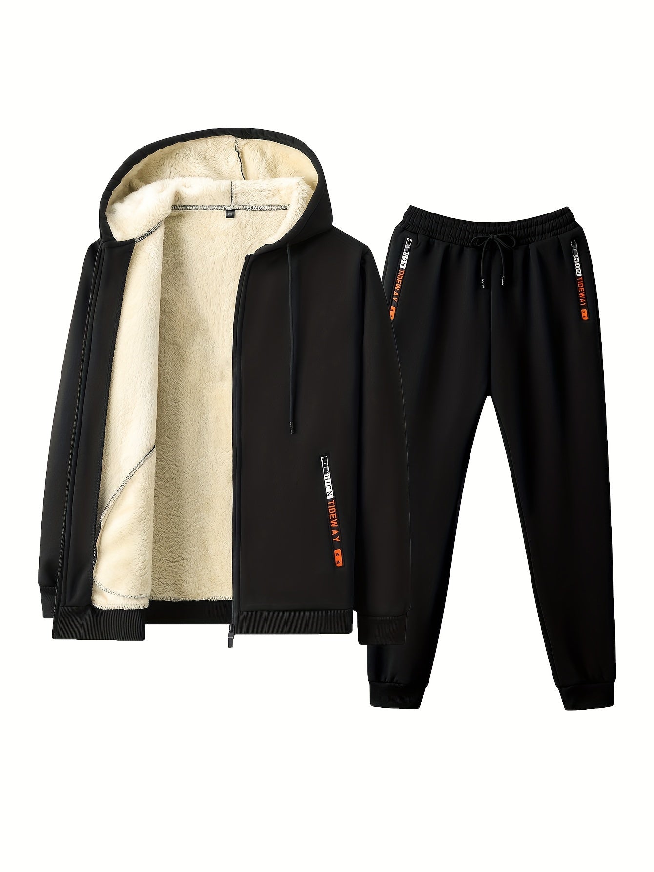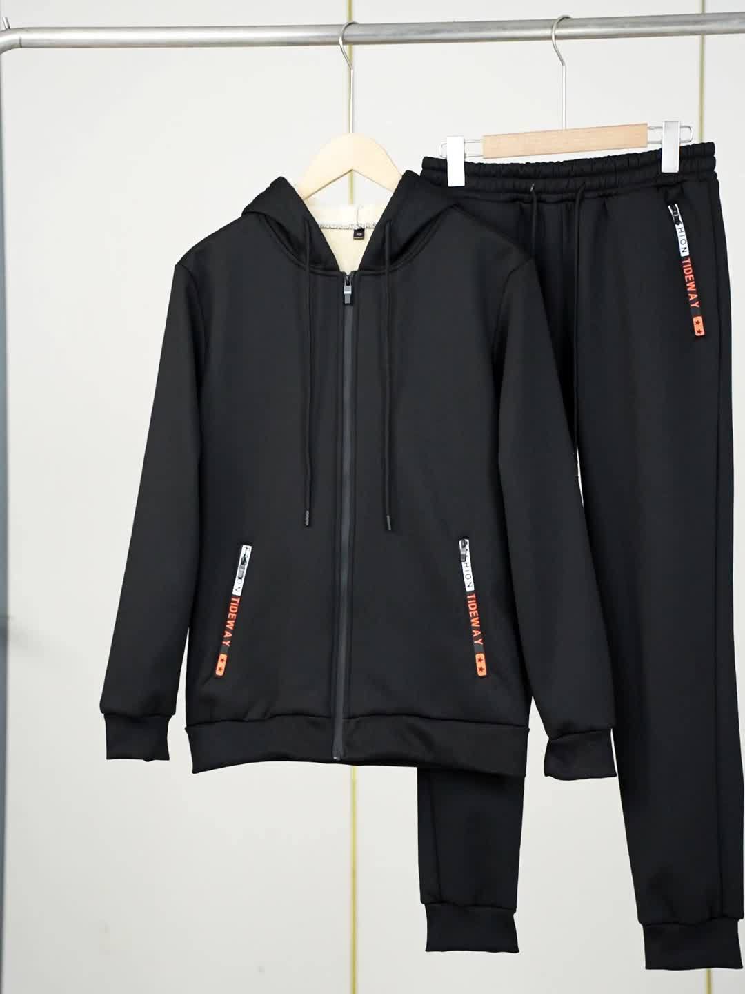 The Men’s Hooded Tracksuit Set includes a zip-up hoodie with fleece lining and drawstring trousers. Designed as a coordinated outfit, it functions as apparel suitable for cool weather use.