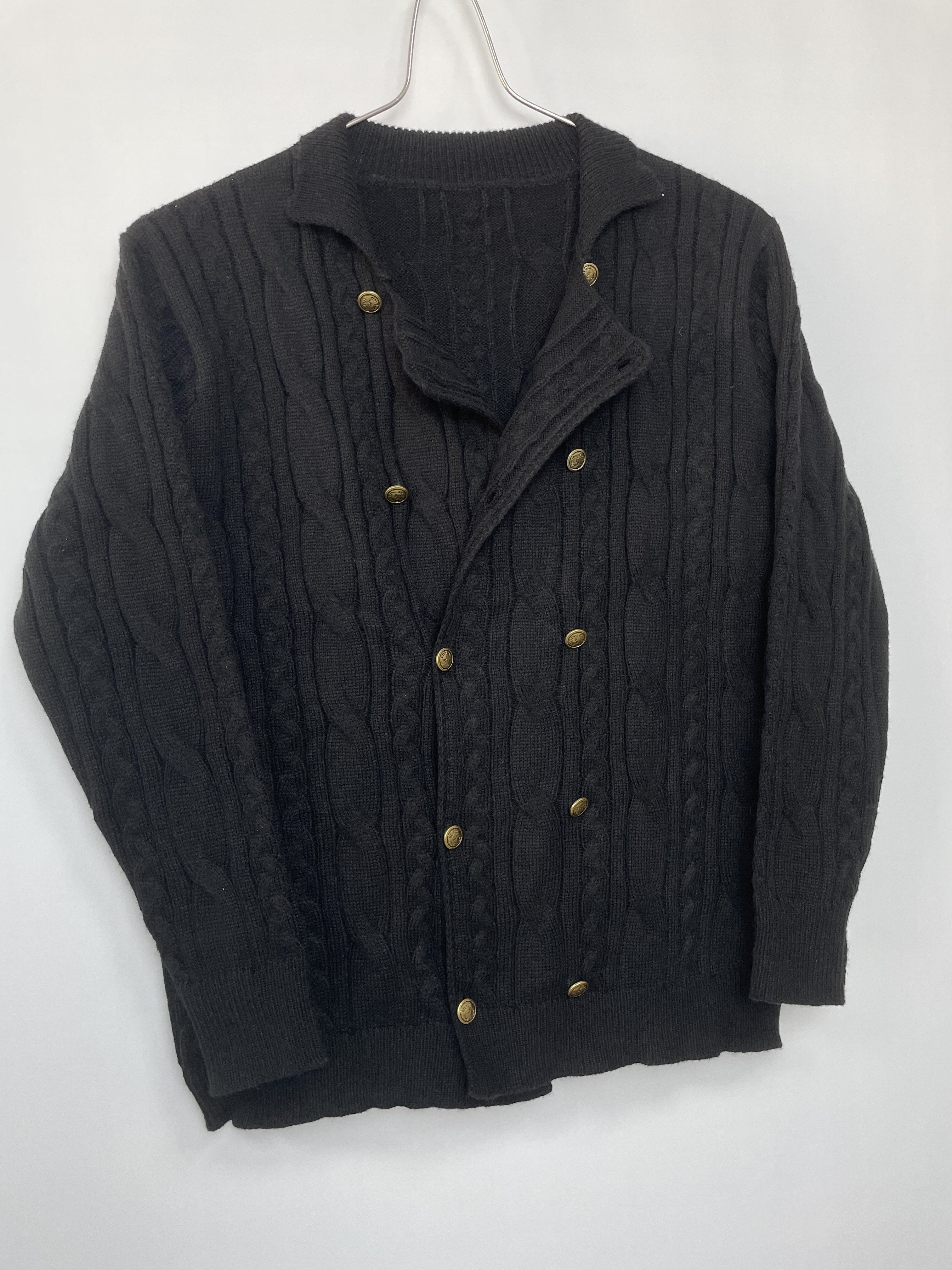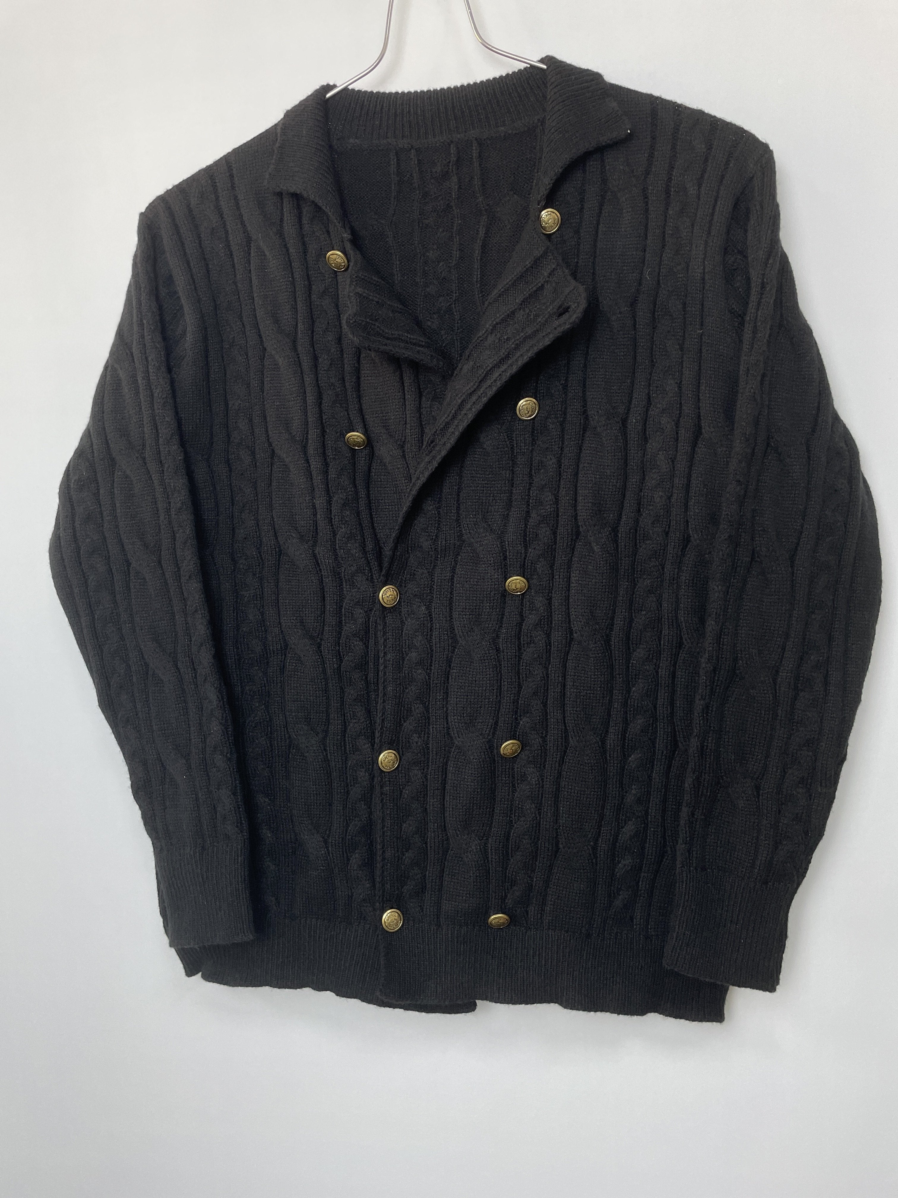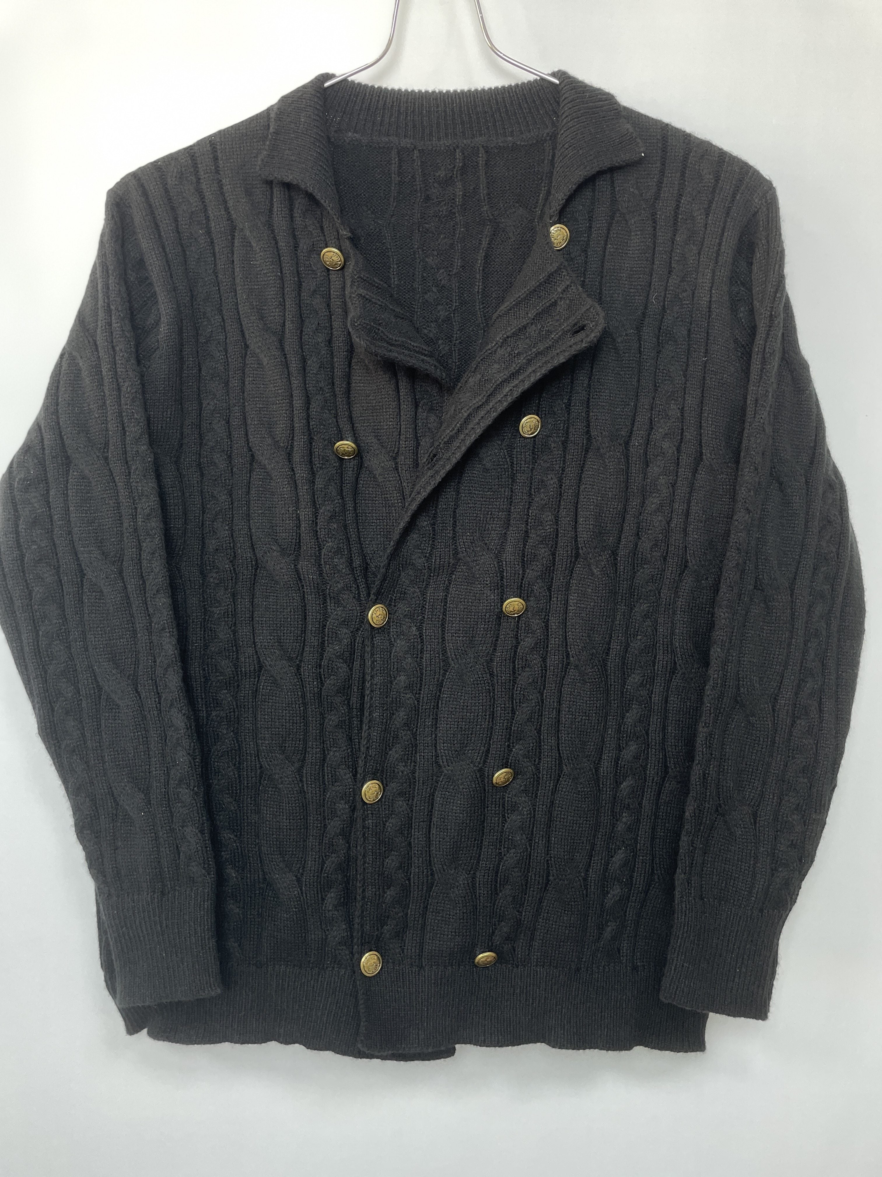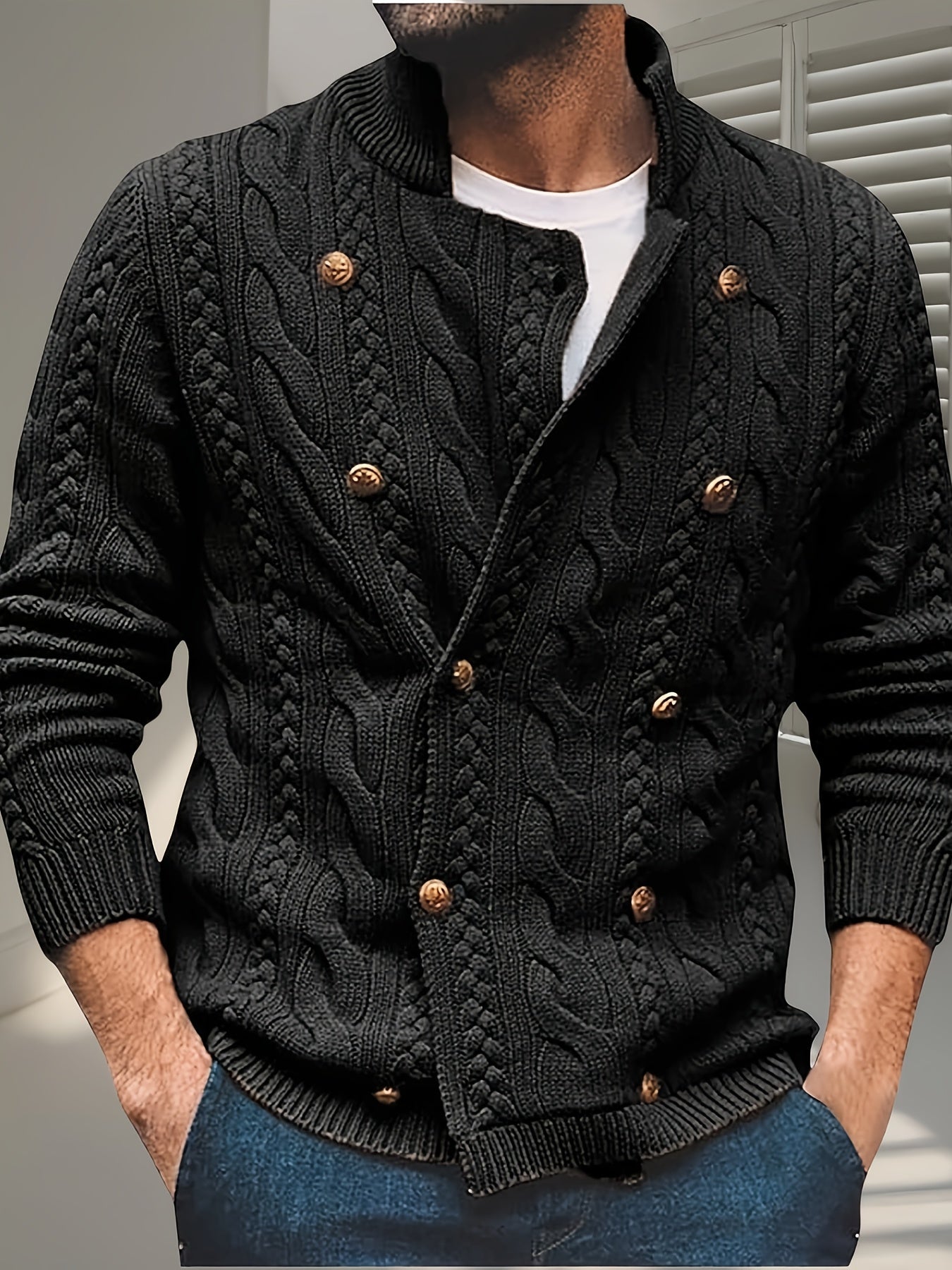 The Men’s Plus Size Cable Knit Cardigan features a double-breasted button closure and a chunky cable-knit texture. Designed with a stand collar and solid finish, it provides a versatile layering option.